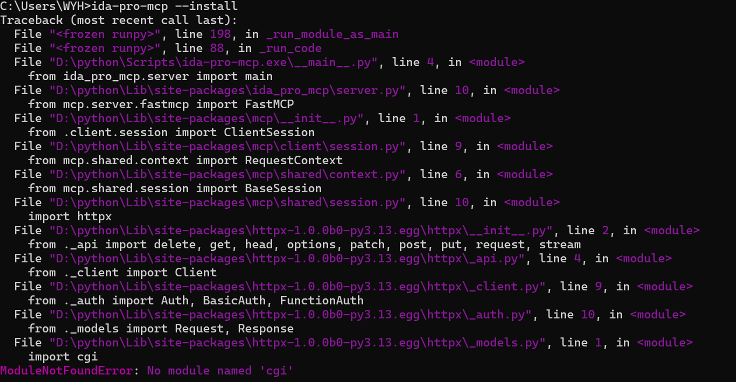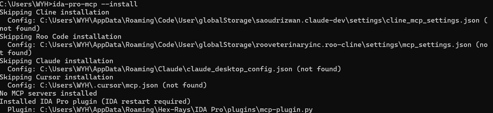 // 如果无法使用ida-pro-mcp --install命令,则cd到python目录下Scripts目录,运行ida-pro-mcp.exe --install